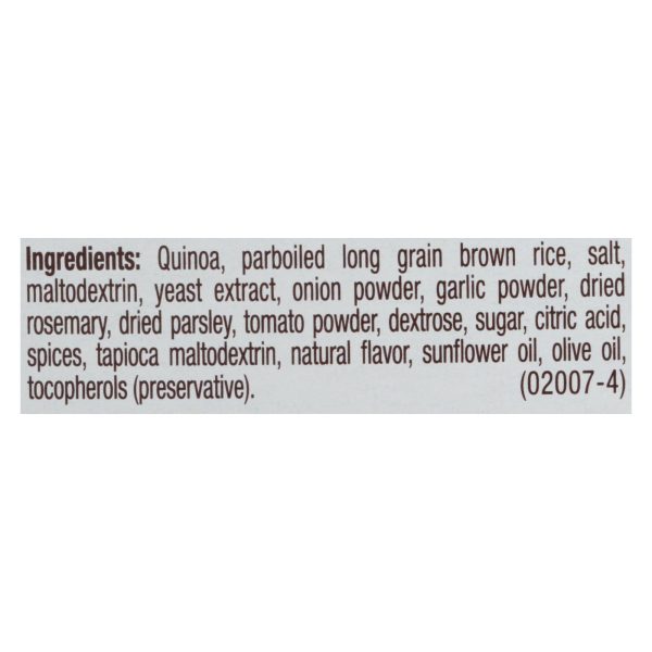 ingredients : quinoa;parboiled long grain brown rice;salt;maltodextrin;yeast extract;onion powder;garlic powder;dried rosemary;dried parsley;tomato powder;dextrose;sugar;citric acid;spices;tapioca maltodextrin;natural flavor;sunflower oil;olive oil;tocopherols;preservative