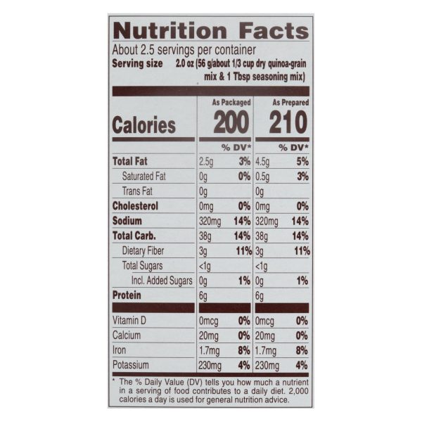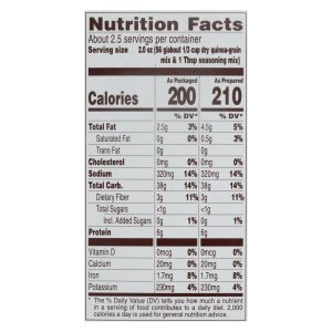 With other natural flavors. Per serving: 200 calories; 0 g sat fat (0% dv); 320 mg sodium (14% dv); less than 1 g total sugars. See additional panel for product information. Non gmo project verified. Nongmoproject.org. At near east, we’re inspired by how well the world eats. Our journey began 50 years ago with a single, homemade armenian rice pilaf recipe. Today, the brand has expanded to a family of hearty grains, blended with vibrant spices and herbs from across the globe. Our simple yet flavorful dishes provide creative inspiration for any meal. Grain milx filled to this line. Nongmoproject.org; neareast.com. Smartlabel: scan here for more food information or call 1-800-822-7423. We’re here to help. Neareast.com or 800.222.7423. Please have package available when calling. Package contains empty space to accommodate grain to seasoning ratio. This package is sold by weight, not by volume. Contents may settle during shipping and handling. Fair trade certified ingredient. See back panel (quinoa: fair trade certified by fair trade usa). At least 40% of fair trade certified ingredients.