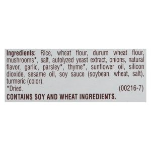 ingredients : rice;wheat flour;durum wheat flour;mushrooms;salt;autolyzed yeast extract;onions;natural flavor;garlic parsley;thyme;sunflower oil;silicon dioxide;sesame oil;soy sauce;soybean;wheat;turmeric;color