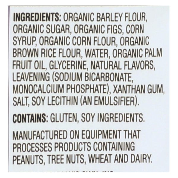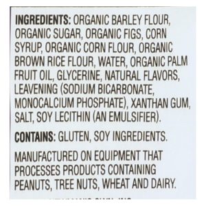ingredients : organic barley flour;organic sugar;organic figs;corn syrup;organic corn flour;organic brown rice flour;water;organic palm fruit oil;glycerine;natural flavors;leavening;sodium bicarbonate;monocalcium phosphate;xanthan gum;salt;soy lecithin;an emulsifier