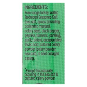 ingredients : free-range turkey;water;redmond seasoned salt (sea salt, spices [including coriander, mustard, celery seed, black pepper, paprika, turmeric, parsley], garlic, onion);encapsulated lactic acid;cultured celery powder (celery powder, sea salt);in beef collagen casing
