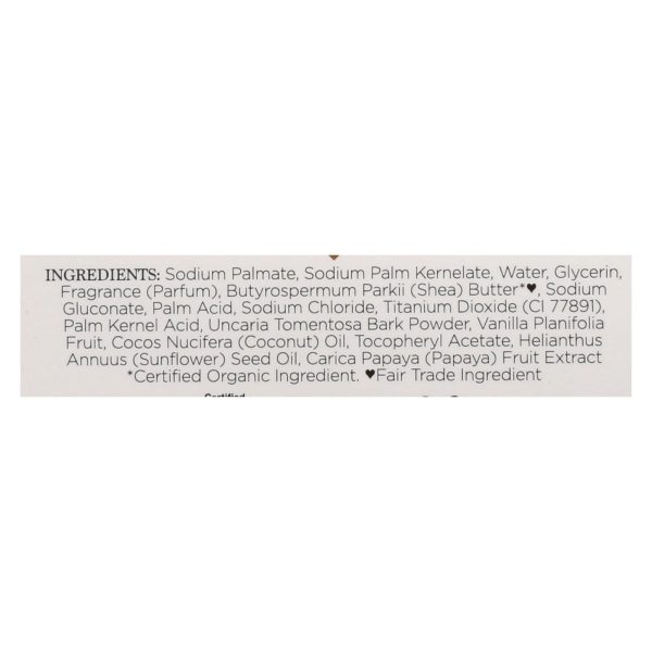 ingredients : sodium palmate;sodium palm kernelate;water;glycerin;fragrance;parfum;butyrospermum parkii;shea;butter*♥;sodium gluconate;palm acid;sodium chloride;titanium dioxide;ci 77891;palm kernel acid;uncaria tomentosa bark powder;vanilla planifolia fruit;cocos nucifera;coconut;oil;tocopheryl acetate;helianthus annuus;sunflower;seed oil;carica papaya;papaya;fruit extract