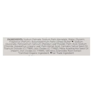 ingredients : sodium palmate;sodium palm kernelate;water;glycerin;fragrance;parfum;butyrospermum parkii;shea;butter*•;sodium gluconate;petroselinum sativum;parsley;leaf powder;palm acid;sodium chloride;aspalathus linearis leaf;palm kernel acid;cannabis sativa seed oil;titanium dioxide;ci 77891;iron oxides;ci 77492;melia azadirachta seed oil;neem;ci 77499;vetiveria zizanoides root extract