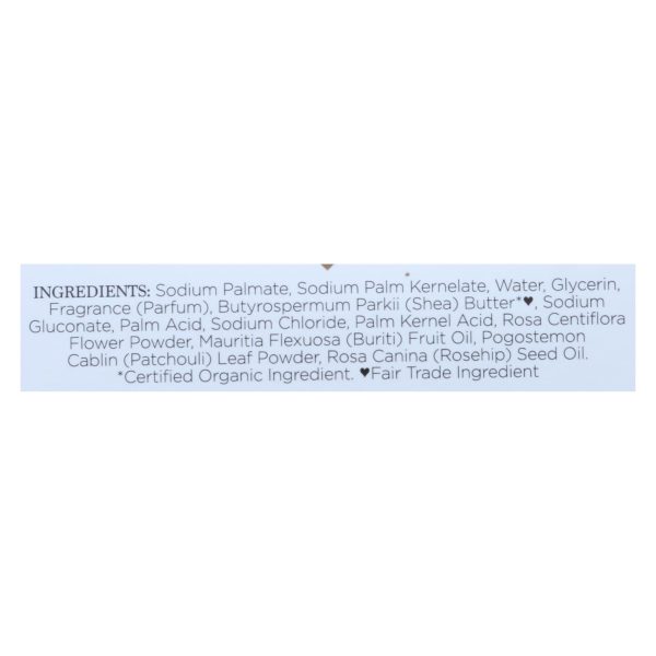 ingredients : sodium palmate;sodium palm kernelate;water;glycerin;fragrance;parfum;butyrospermum parkii;shea;butter*♥;sodium gluconate;palm acid;sodium chloride;palm kernel acid;rosa centiflora flower powder;mauritia flexuosa;buriti;fruit oil;pogostemon cablin;patchouli;leaf powder;rosa canina;rosehip;seed oil
