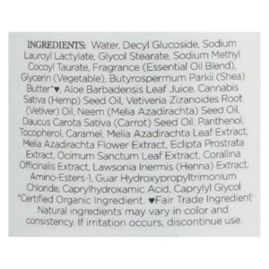 ingredients : water;decyl glucoside;sodium lauroyl lactylate;glycol stearate;sodium methyl cocoyl taurate;fragrance;essential oil blend;glycerin;vegetable;butyrospermum parkii;shea;butter*♥;aloe barbadensis leaf juice;cannabis sativa;hemp;seed oil;vetiveria zizanoides root;vetiver;oil;neem;melia azadirachta;daucus carota sativa;carrot;panthenol;tocopherol;caramel;melia azadirachta leaf extract;melia azadirachta flower extract;eclipta prostrata extract;ocimum sanctum leaf extract;corallina officinalis extract;