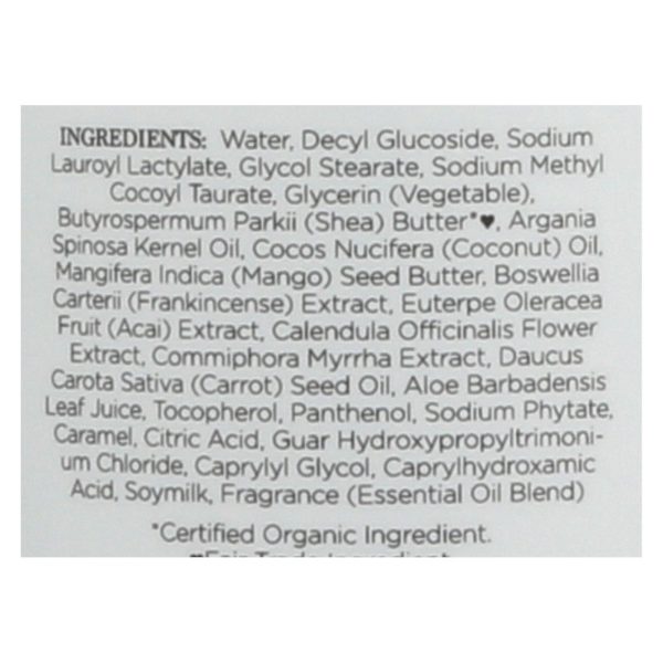 ingredients : water;decyl glucoside;sodium lauroyl lactylate;glycol stearate;sodium methyl cocoyl taurate;glycerin;vegetable;butyrospermum parkii;shea;butter*♥;argania spinosa kernal oil;cocos nucifera;coconut;oil;mangifera indica;mango;seed butter;boswellia carterii;frankincense;extract;euterpe oleracea fruit;acai;calendula officinalis flower extract;commiphora myrrha extract;daucus carota sativa;carrot;seed oil;aloe barbadensis leaf juice;tocopherol;panthenol;sodium phytate;caramel;citric acid;guar hydroxyp