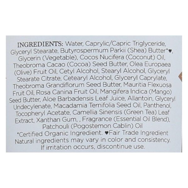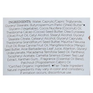 ingredients : water;caprylic/capric triglyceride;glyceryl stearate;butyrospermum parkii;shea;butter*♥;glycerin;vegetable;cocos nucifera;coconut;oil;theobroma cacao;cocoa;seed butter;olea europaea;olive;fruit oil;cetyl alcohol;stearyl alcohol;glyceryl stearate citrate;cetearyl alcohol;glyceryl caprylate;theobroma grandiflorum seed butter;mauritia flexuosa fruit oil;rosa canina fruit oil;mangifera indica;mango;aloe barbadensis leaf juice;allantoin;glyceryl undecylenate;macadamia ternifolia seed oil;panthenol;to