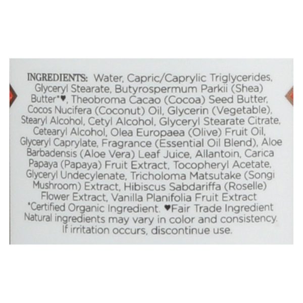 ingredients : water;capric/caprylic triglycerides;glyceryl stearate;butyrospermum parkii;shea;butter*♥;theobroma cacao;cocoa;seed butter;cocos nucifera;coconut;oil;glycerin;vegetable;stearyl alcohol;cetyl alcohol;glyceryl stearate citrate;cetearyl alcohol;olea europaea;olive;fruit oil;glyceryl caprylate;fragrance;essential oil blend;aloe barbadensis;aloe vera;leaf juice;allantoin;carica papaya;papaya;fruit extract;tocopheryl acetate;glyceryl undecylenate;tricholoma matsutake;songi mushroom;extract;hibiscus sa