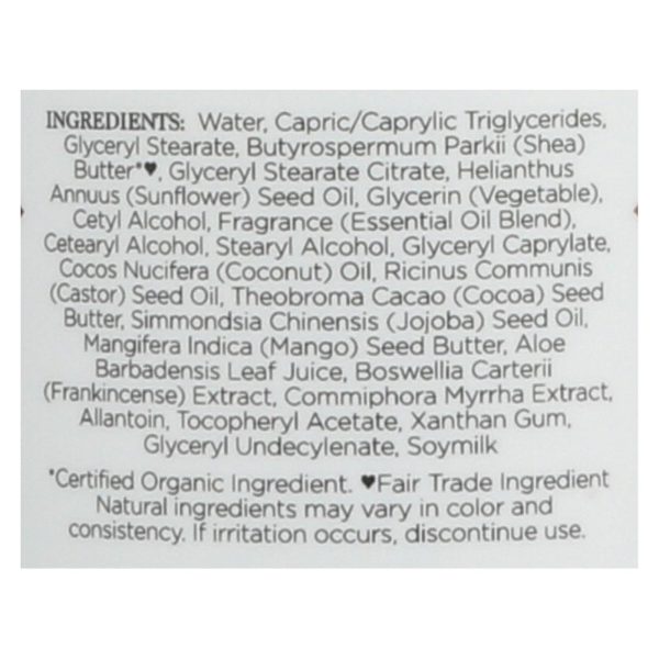 ingredients : water;capric/caprylic triglycerides;glyceryl stearate;butyrospermum parkii;shea;butter*♥;glyceryl stearate citrate;helianthus annuus;sunflower;seed oil;glycerin;vegetable;cetyl alcohol;fragrance;essential oil blend;cetearyl alcohol;stearyl alcohol;glyceryl caprylate;cocos nucifera;coconut;oil;ricinus communis;castor;theobroma cacao;cocoa;seed butter;simmondsia chinensis;jojoba;mangifera indica;mango;aloe barbadensis leaf juice;boswellia carterii;frankincense;extract;commiphora myrrha extract;all