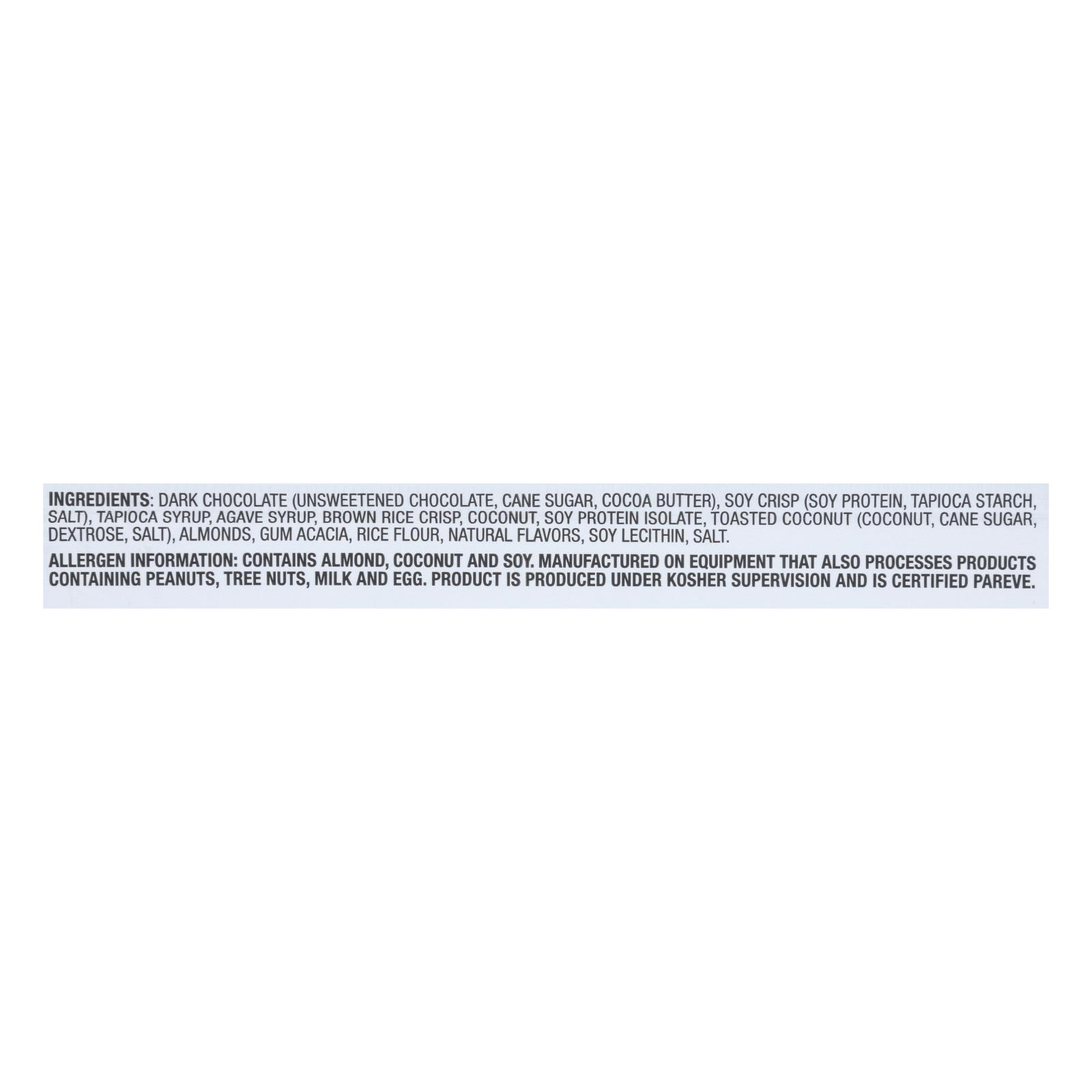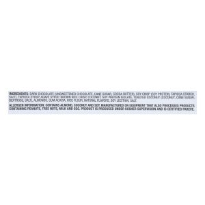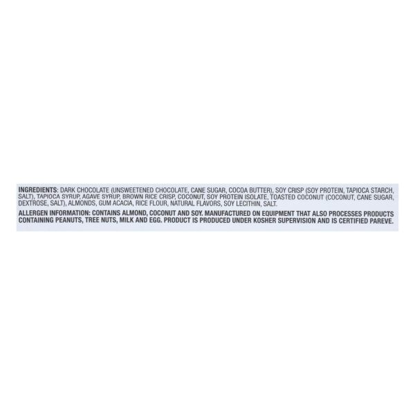 ingredients : dark chocolate (unsweetened chocolate, cane sugar, cocoa butter);soy crisp (soy protein, tapioca starch, salt);tapioca syrup;agave syrup;brown rice crisp;coconut;soy protein;toasted coconut (coconut, cane sugar, dextrose, salt);almonds;gum acacia;rice flour;natural flavors;soy lecithin;salt