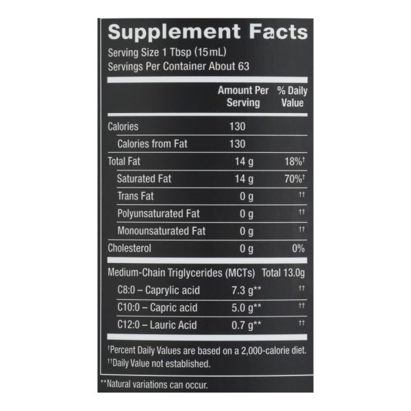 Nutiva organic mct oil is an oil concentrated with the medium-chain triglycerides, capric acid and caprylic acid. Medium-chain triglycerides, or mcts, are the types of saturated fatty acids typically found in coconuts. Using a usda certified organic process, we gently remove the fats from virgin coconut oil that remain solid at room temperature, leaving high levels of capric and caprylic acids. Unlike non-organic mct oil brands, there are no chemicals or filler oils used during this process, resulting in a clean, light coconut-flavored mct oil with no harsh aftertaste. Our mct oil is derived only from coconuts and has more mcts per serving than any other brand, making it an excellent option for athletes or those following a vegan, paleo, or plant-based diet. Includes one 32 oz. Bottle of nutiva organic mct oil. See nutrition facts panel for allergens. We say food doesn’t have to be a choice between the lesser of evils. Together, we can revolutionize the way the world eats.