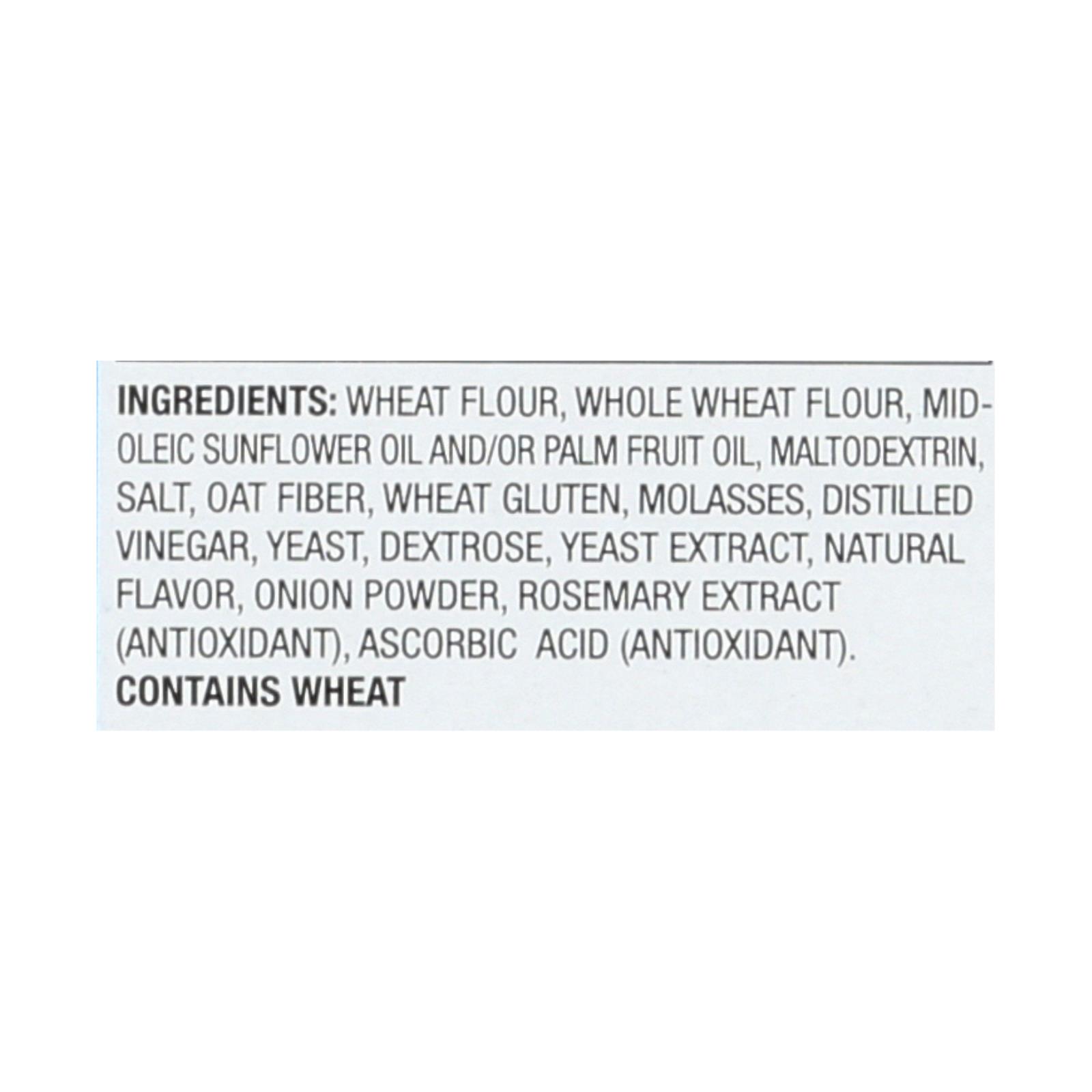 ingredients : wheat flour;whole wheat flour;mid-oleic sunflower oil and/or palm fruit oil;maltodextrin;salt;oat fiber;wheat gluten;molasses;distilled vinegar;yeast;dextrose;yeast extract;natural flavor;onion powder;rosemary extract;antioxidant;ascorbic acid