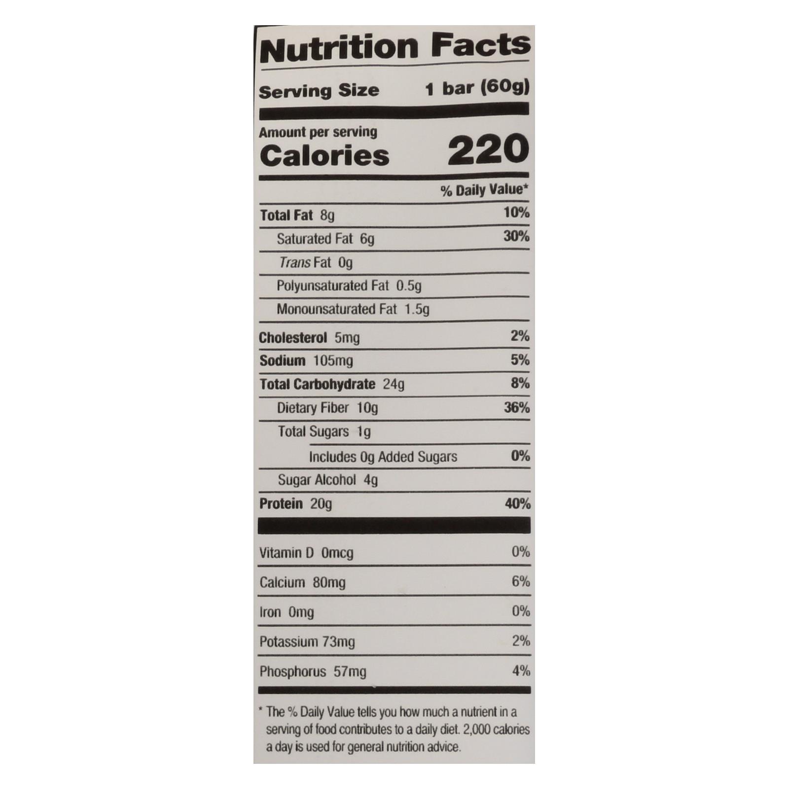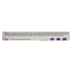 ingredients : protein blend;milk protein isolate;whey protein isolate;soluble vegetable fiber;isomaltooligosaccharides;vegetable source;vegetable glycerin;palm kernel oil;maltitol;almond butter;natural flavors;soy lecithin;an emulsifier;nonfat dry milk;whey protein concentrate;sea salt;vegetable juice;for color;tapioca starch;distilled monoglycerides;sucralose and calcium carbonate