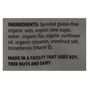 ingredients : sprouted gluten-free organic oats;organic cane sugar;organic flax;organic sunflower oil;organic cinnamon;unrefined salt;tocopherols (vitamin e)