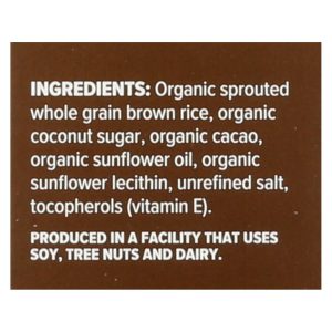 ingredients : organic sprouted whole grain brown rice;organic coconut sugar;organic cacao;organic sunflower oil;organic sunflower lecithin;unrefined salt;tocopherols;vitamin e