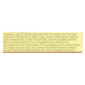 ingredients : sodium palmate;saponified palm oil;sodium palm kernelate;saponified palm kernel oil;water;aqua;parfum;100% natural fragrance and/or essential oils;sodium chloride;salt;glycerin;vegetable glycerin;maris sal;dead sea salt;prunus amygdalus dulcis;almond;fruit;butyrospermum parkii;shea butter;sweet almond oil;argania spinosa;argan oil;caramel;plant based pigment;gardenia florida extract;citric acid;tocopherol;vitamin e