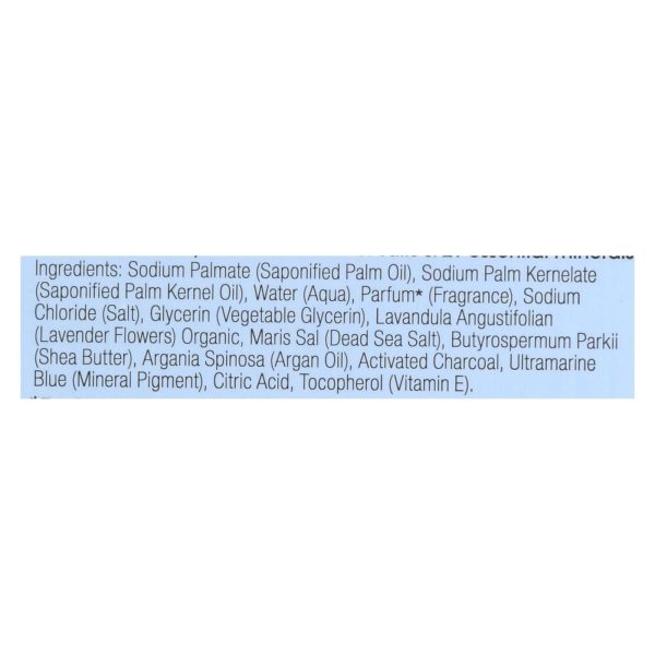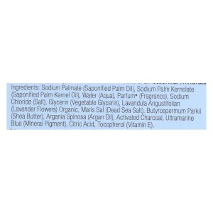 ingredients : sodium palmate;saponified palm oil;sodium palm kernelate;saponified palm kernel oil;water;aqua;parfum;fragrance;sodium chloride;salt;glycerin;vegetable glycerin;lavandula angustifolian;lavender flowers;organic;maris sal;dead sea salt;butyrospermum parkii;shea butter;argania spinosa;argan oil;activated charcoal;ultramarine blue;mineral pigment;citric acid;tocopherol;vitamin e