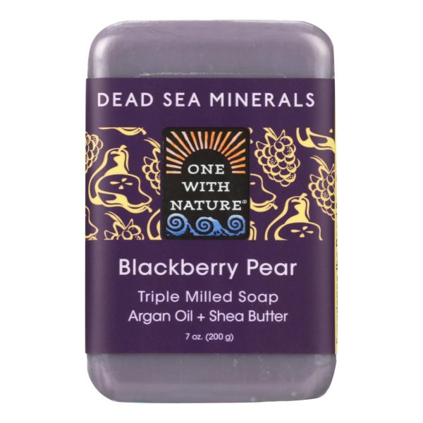 One with nature dead sea bar soap blackberry pear is a gentle yet powerful soap. Made with primarily with naturally derived ingredients, this soap is largely free of unnatural additives. This products contains moisturizing shea butter and argan oil. Each bar of one with nature dead sea bar soap blackberry pear weighs 7 oz.