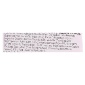 ingredients : sodium palmate;saponified palm oil;sodium palm kernelate;saponified palm kernel oil;water;aqua;parfum;fragrance;glycerin;vegetable glycerin;sodium chloride;salt;maris sal;dead sea salt;butyrospermum parkii;shea butter;argania spinosa;argan oil;ultramarine;mineral pigment;bugaris;beet;root extract and brassica olearacea capitata;cabbage;leaf extract;plant based pigment;ultramarine blue;citric acid;tocopherol;vitamin e