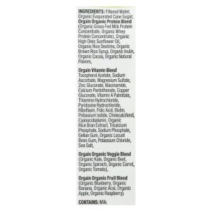 ingredients : filtered water;orgain organic protein blend (grass fed milk protein concentrate*, whey protein concentrate*);rice dextrin;cane sugar;high oleic sunflower oil;brown rice syrup;inulin;alkalized cocoa powder;natural flavors;sunflower lecithin;tricalcium phosphate;disodium phosphate;magnesium phosphate;potassium chloride;natural flavor;orgain vitamin & mineral blend (sodium ascorbate, zinc gluconate, d-alpha tocopheryl acetate, manganese sulfate, niacinamide, beta carotene, potassium iodide,c