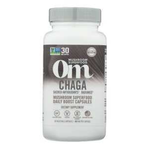 Dietary supplement. Sacred antioxidants. Radiance. Mushroom superfood daily boost capsules. 2,000 mg per serving. Vegan. Gluten free. Non gmo project verified. Nongmoproject.org. Certified kosher by earthkosher. Mushroom superfood. Youthful radiance. Antioxidant support. 30 day supply. Om chaga. The radiance mushroom: chaga can help promote healthy skin by warding off free radical damage and supporting a youthful radiance. We love om chaga capsules in the evening to help supercharge our beauty sleep. Why mushrooms? did you know? mushrooms are truly a unique superfood. They contain many bioactive nutrients that we have a hard time getting from plant or animal sources. Each serving of om provides 2,000mg of mushroom power: super antioxidants; beta glucans and prebiotics; no added sugars or fillers. Powered by om: at om, we grow functional mushrooms at our indoor farm in california. They contain a full spectrum of active compounds, the way nature intended. We believe in the power of the whole food mushroom and its full array of benefits to support optimal health. Expertly crafted to elevate the mind and body, we’ve harnessed the benefits of the mushroom kingdom in a convenient daily boost capsule. Enjoy and feel om-azing! no synthetic or artificial ingredients. Tested for heavy metals. Mushroom identity guaranteed. Find your om at ommushrooms.com. Instagram. Facebook. Twitter. (these statements have not been evaluated by the food and drug administration. This product is not intended to diagnose, treat, cure, or prevent any disease.) usa grown mushrooms.