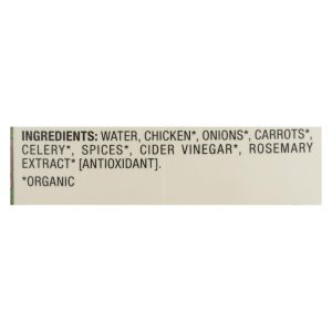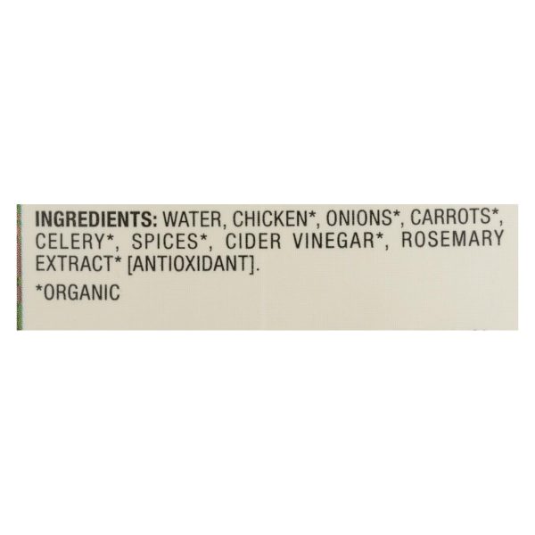 ingredients : water;chicken;onions;carrots;celery;spices;cider vinegar;rosemary extract* [antioxidant]keywords : calorie;cooking;drink;free;gluten;low;organic;protein