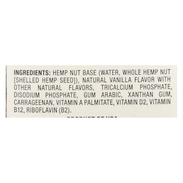 ingredients : hemp nut base;water;whole hemp nut [shelled hemp seed];natural vanilla flavor with other natural flavors;tricalcium phosphate;disodium phosphate;gum arabic;xanthan gum;carrageenan;vitamin a palmitate;vitamin d2;vitamin b12;riboflavin;b2