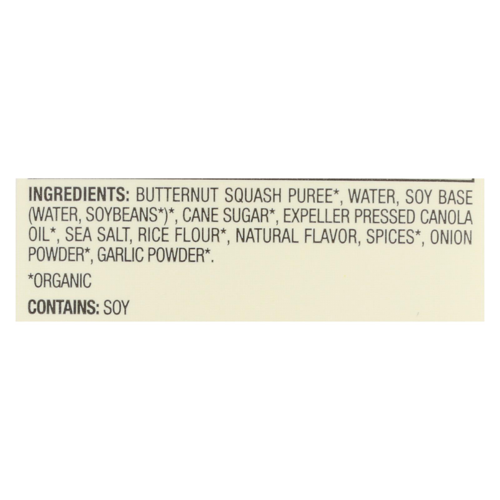 ingredients : butternut squash puree;water;soy base;soybean;cane sugar;expeller pressed canola oil;sea salt;rice flour;natural flavor;spices;onion powder;garlic powder