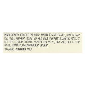 ingredients : reduced fat milk;water;tomato paste;cane sugar;red bell pepper;roasted red bell pepper;roasted garlic;butter;sodium citrate;nonfat dry milk;sea salt;rice flour;garlic powder;onion powder;spices