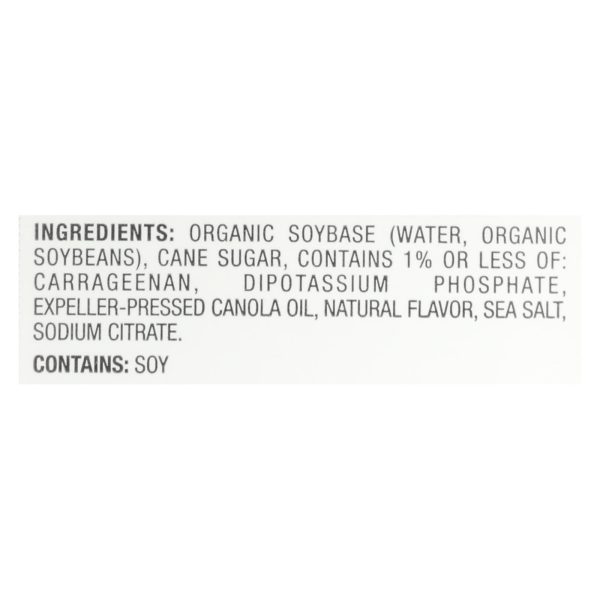 ingredients : organic soybase;water;organic soybeans;cane sugar;contains 1% or less of: carrageenan;dipotassium phosphate;expeller-pressed canola oil;natural flavor;sea salt;sodium citrate
