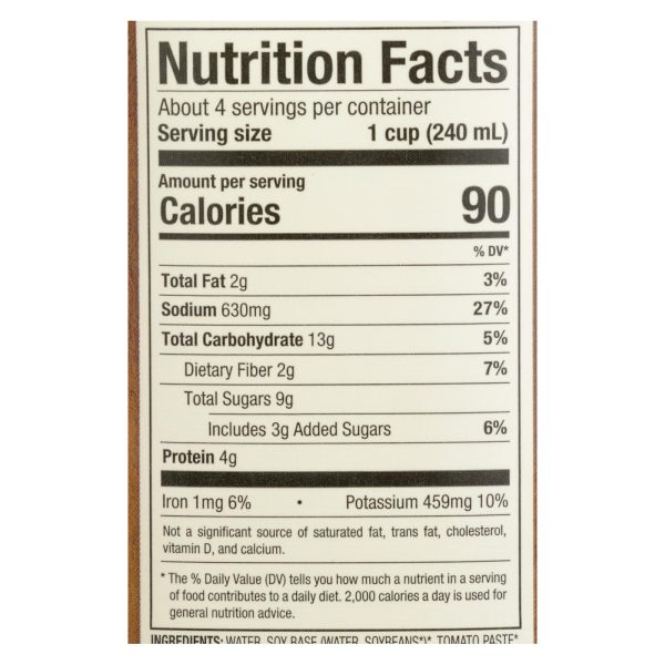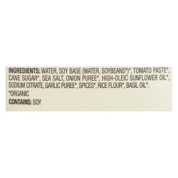 ingredients : water;soy base;soybeans;tomato paste;cane sugar;sea salt;onion puree;high-oleic sunflower oil;sodium citrate;garlic puree;spices;rice flour;basil oil