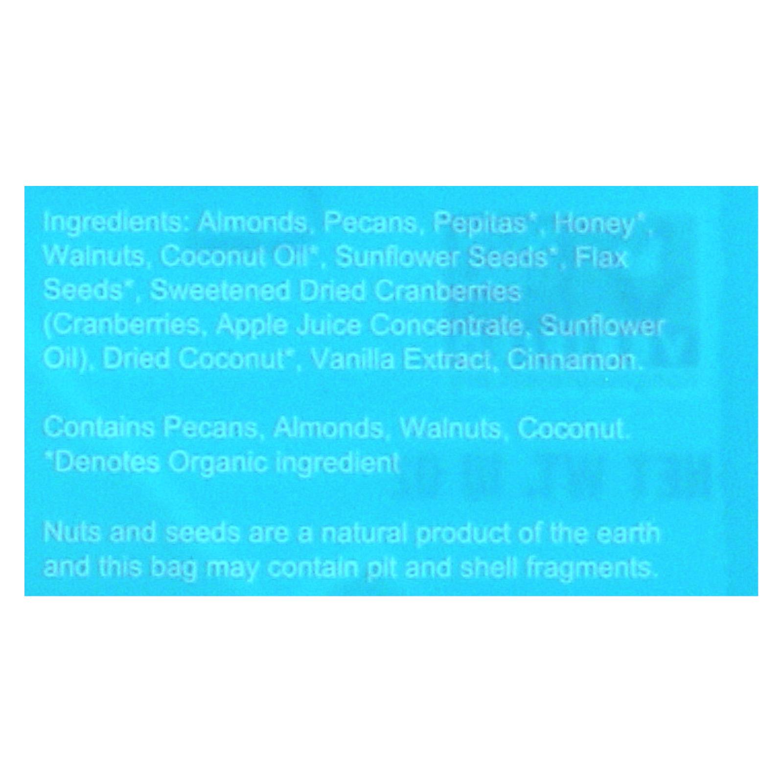 ingredients : almonds;pecans;pepitas;honey;walnuts;coconut oil;sunflower seeds;flax seeds;sweetened dried cranberries;cranberries;apple juice concentrate;sunflower oil;dried coconut;vanilla extract;cinnamon