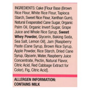 ingredients : cake [flour base (brown rice flour, white rice flour, tapioca starch, sweet rice flour, xanthan gum), natural evaporated cane sugar, organic palm oil, organic invert sugar, grape juice and whole rice syrup, sweet whey powder, glycerin, baking soda, sea salt, lemon oil];jam [raspberry paste (cane syrup, brown rice syrup, apple powder, rice starch, dried cane syrup, glycerin, water, raspberry juice concentrate, pectin, natural flavor, citric acid, red cabbage extract for color), fig, citric acid]keywords : dessert;free;gluten;kosher;natural;snack