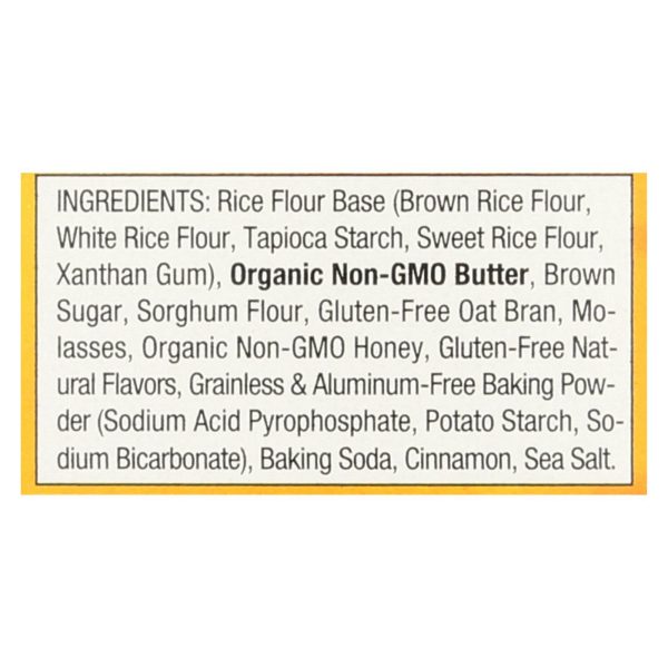 ingredients : rice flour base;brown rice flour;white rice flour;tapioca starch;sweet rice flour;xanthan gum;organic non-gmo butter;brown sugar;sorghum flour;gluten-free oat bran;molasses;organic non-gmo honey;gluten-free natural flavors;grainless & aluminum-free baking powder;sodium acid pyrophosphate;potato starch;sodium bicarbonate;baking soda;cinnamon;sea salt