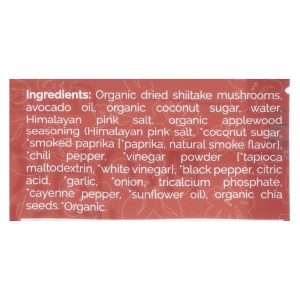 ingredients : organic dried shiitake mushrooms;avocado oil;organic coconut sugar;water;himalayan pink salt;organic applewood seasoning;coconut sugar;smoke paprika {*paprika;natural smoke flavor};chili pepper;vinegar powder {*tapioca maltodextrin;white vinegar};black pepper;citric acid;garlic;onion;tricalcium phosphate;cayenne pepper;sunflower oil;organic chia seeds