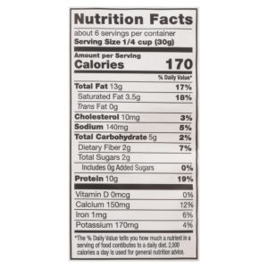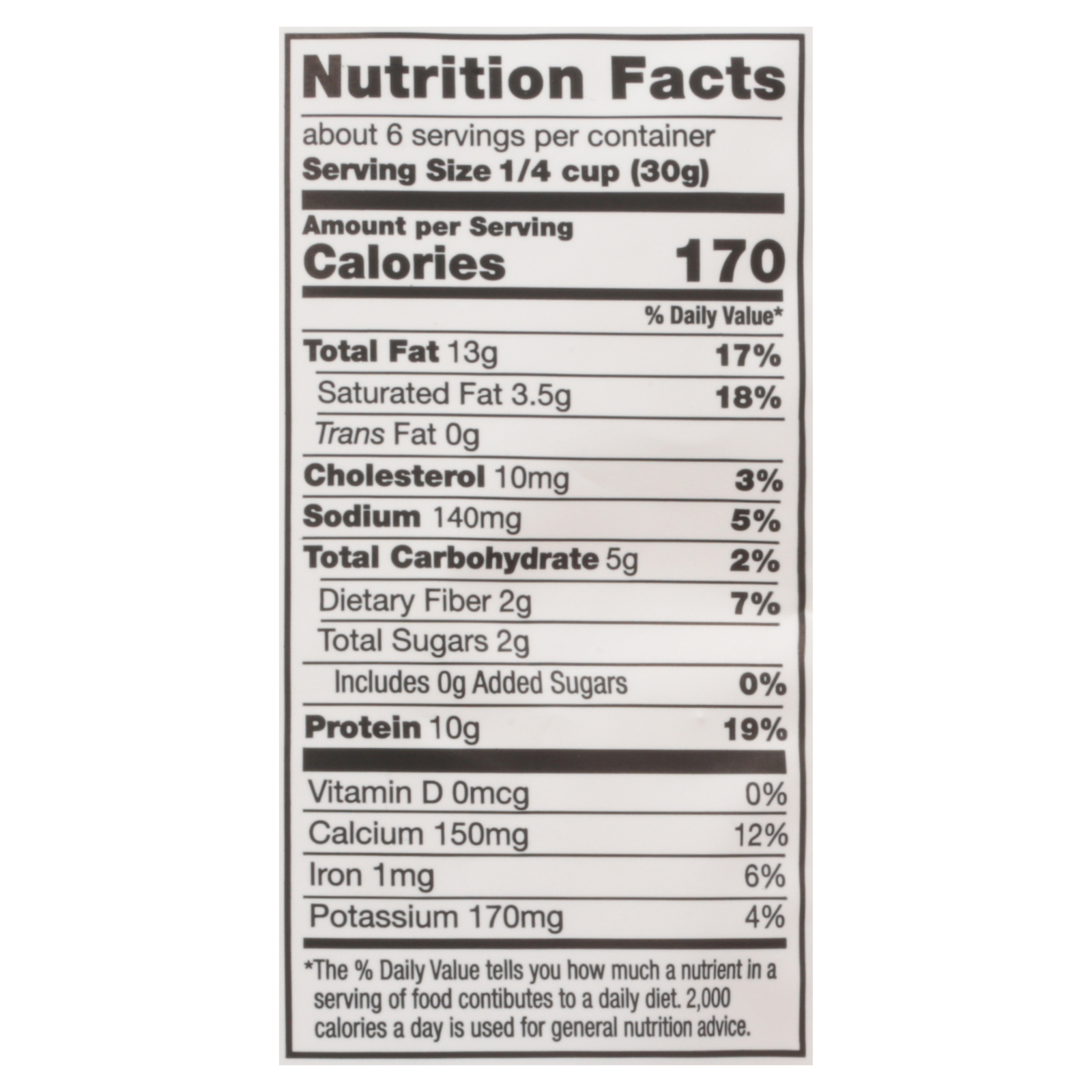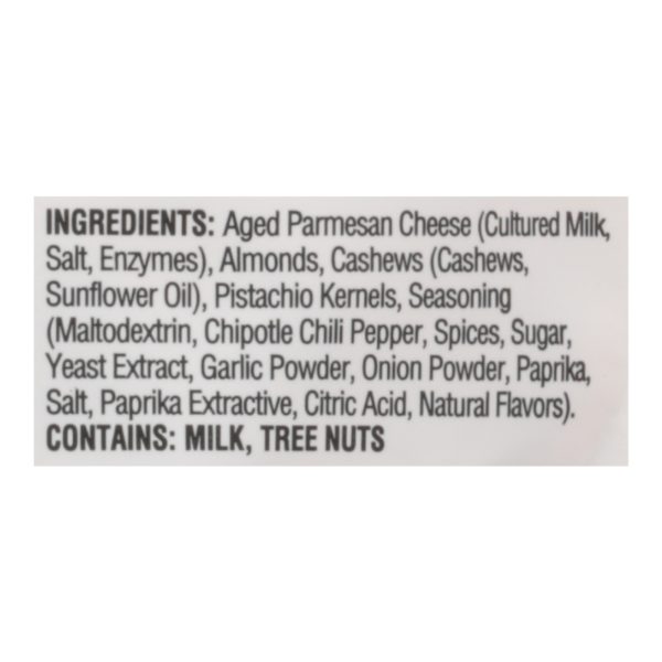 ingredients : almonds (almonds, sunflower oil);parmesan cheese crisps (cultured milk, salt, enzymes);cashews (cashews, sunflower oil);pistachios;bbq seasoning (maltodextrin, chipotle chili pepper, spices, yeast extract, sugar, garlic powder, onion powder, paprika, salt, paprika extractive, citric acid, natural smoke flavor, natural flavors (including natural chipotle flavor)
