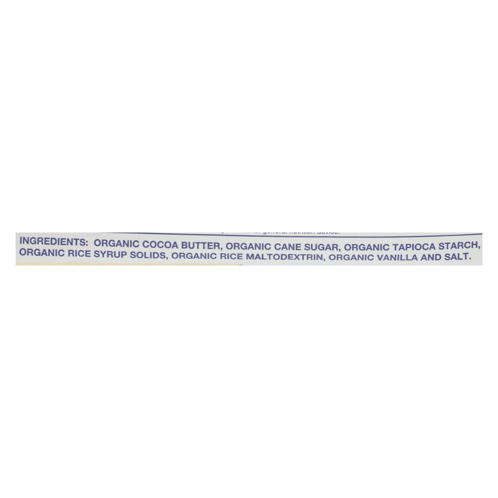 ingredients : organic cocoa butter;organic cane sugar;organic tapioca starch;organic rice syrup solids;organic rice maltodextrin;organic vanilla and salt