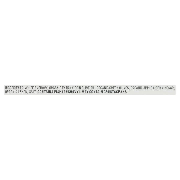 ingredients : white anchovy;organic extra virgin olive oil;organic green olives;organic apple cider vinegar;organic lemon;salt