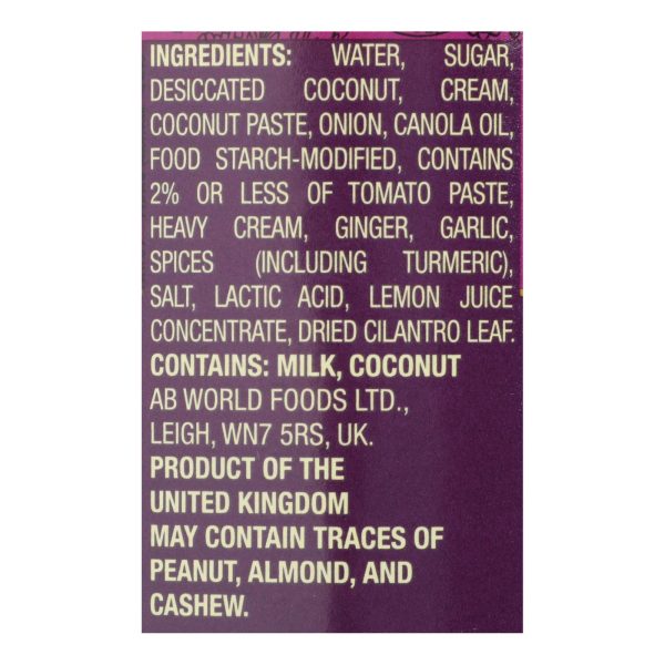 ingredients : water;sugar;desiccated coconut;cream;coconut paste;onion;canola oil;food starch-modified;contains 2% or less of tomato paste;heavy cream;ginger;garlic;spices;including turmeric;salt;lactic acid;lemon juice concentrate;dried cilantro leaf