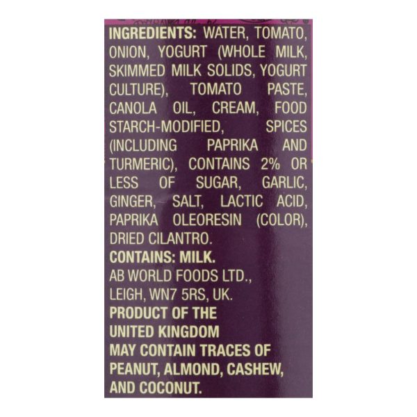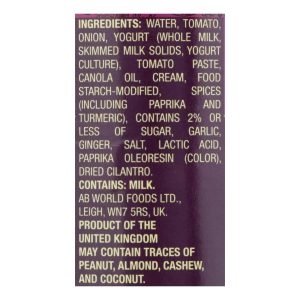 ingredients : water;tomato;onion;yogurt;whole milk;skimmed milk solids;yogurt culture;tomato paste;canola oil;cream;food starch-modified;spices;including paprika and turmeric;contains 2% or less of sugar;garlic;ginger;salt;lactic acid;paprika oleoresin;color;dried cilantro