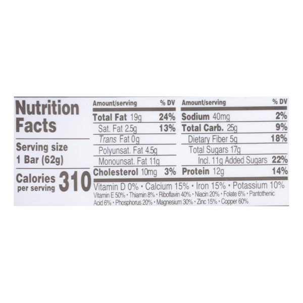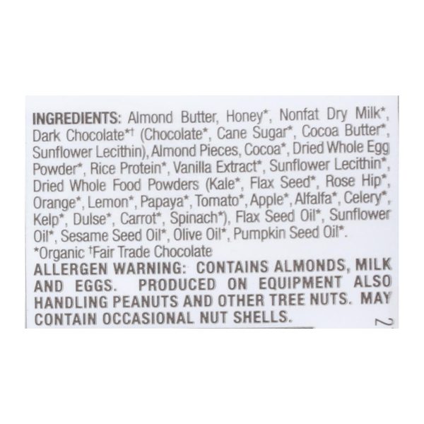 ingredients : almond butter;honey;nonfat dry milk;dark chocolate* (chocolate*, cane sugar*, cocoa butter*, sunflower lecithin);almond pieces;cocoa;dried whole egg powder;rice protein;vanilla extract;dried whole food powders (kale*, flax seed*, rose hip*, orange*, lemon*, papaya*, tomato*, apple*, alfalfa*, celery*, kelp*, dulse*, carrot*, spinach*);flax seed oil;sunflower oil;sesame seed oil;olive oil;pumpkin seed oil