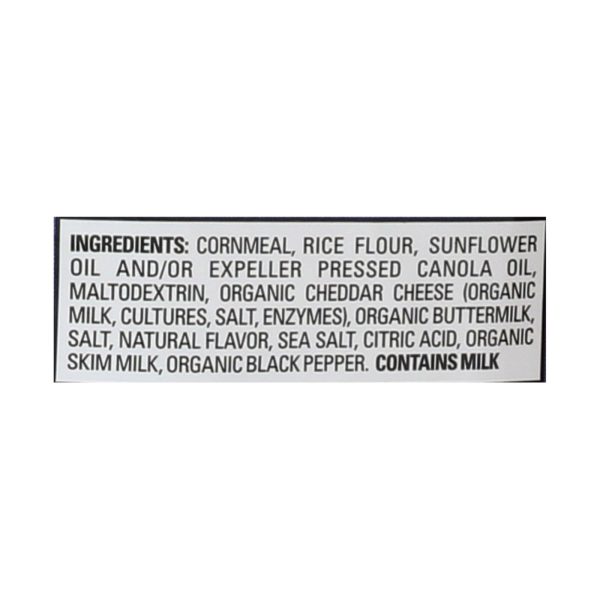 ingredients : cornmeal;rice flour;sunflower oil and/or expeller pressed canola oil;maltodextrin;organic cheddar cheese;organic milk;cultures;salt;enzymes;organic buttermilk;natural flavor;sea salt;citric acid;organic skim milk;organic black pepper