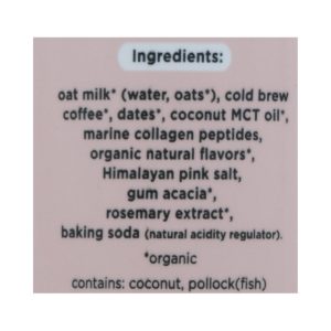 ingredients : oat milk (organic) (water, oats (organic)), cold brew coffee (organic), dates (organic), coconut mct oil (organic), marine collagen peptides, organic natural flavors (organic), himalayan pink salt, gum acacia (organic), rosemary extract (organic), baking soda (natural acidity regulator).