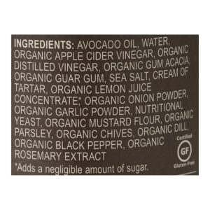 ingredients : avocado oil;water;organic apple cider vinegar;organic distilled vinegar;organic gum acacia;organic guar gum;sea salt;cream of tartar;organic lemon juice concentrate;organic onion powder;organic garlic powder;nutritional yeast;organic mustard flour;organic dried parsley;organic dried chives;organic dried dill;organic black pepper;organic rosemary extract