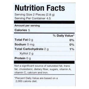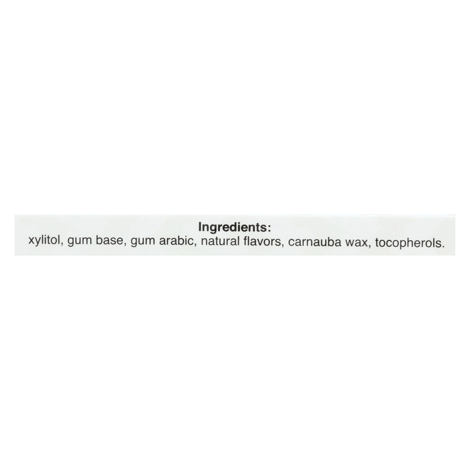 ingredients : xylitol;gum base;gum arabic;natural flavors;carnauba wax;tocopherols