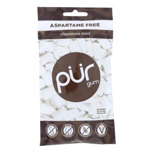 Pur chocolate mint gum is the gum you’ll love not only for its flavor but the benefits. This gum is gluten free, non-gmo and vegan. Here’s the best part. There is no aspartame in this gum, nor does it contain sugar. Pur chocolate mint gum is flavored with xylitol. There are 10 calories in two pieces of gum. Dump the aspartame and enjoy pur gum, with its natural and full flavor that lasts and lasts. This bag of pur chocolate mint gum contains 55 pieces. This is the gum you’ll want in your purse or pocket, to share with family and the friends you care about.