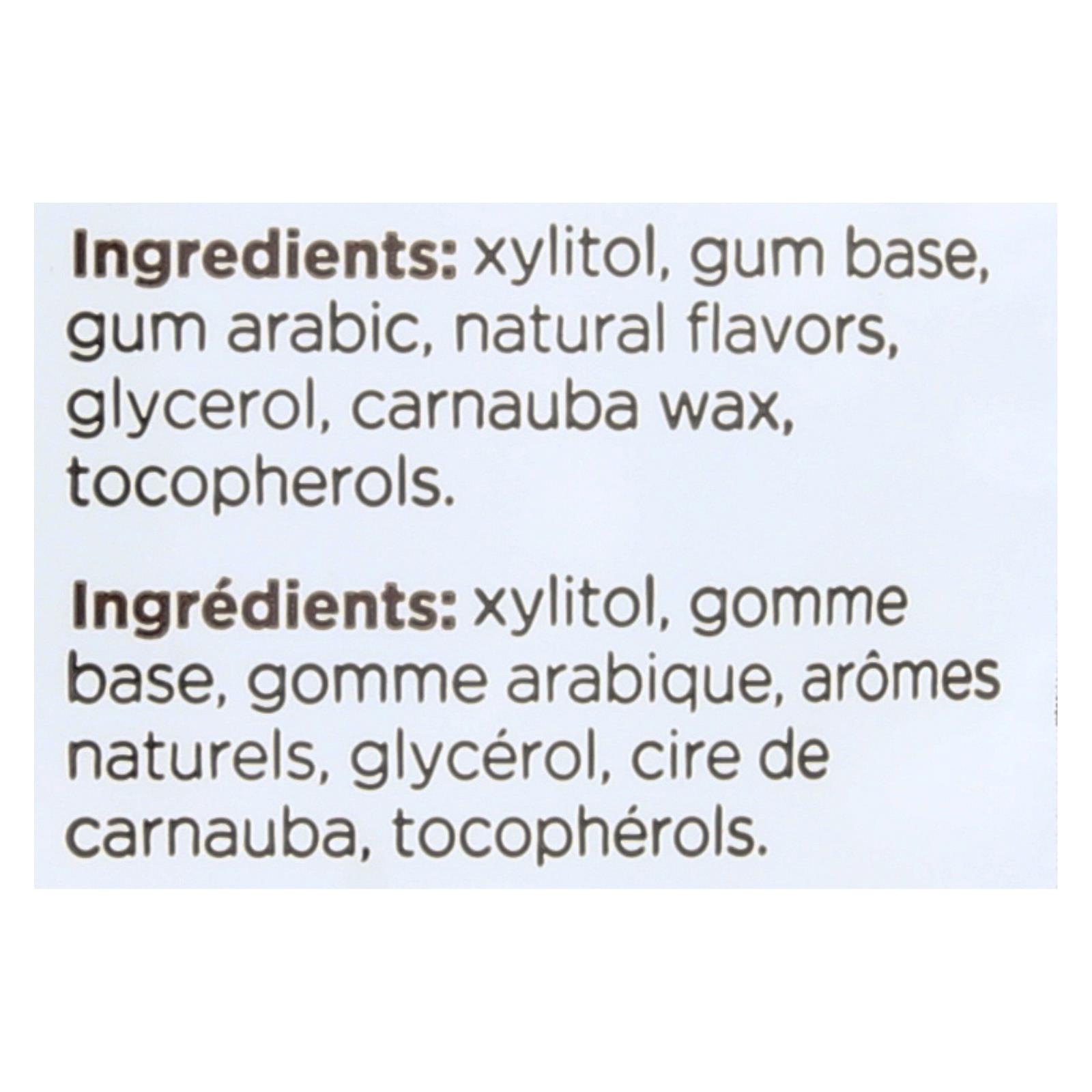 ingredients : xylitol;gum base;gum arabic;natural flavors;glycerol;carnauba wax;tocopherols