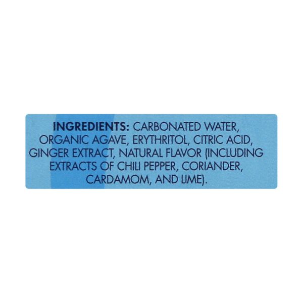 ingredients : carbonated water, organic agave, erythritol, citric acid, ginger extract, natural flavor (including extracts of chili pepper, coriander, cardamom, and lime).