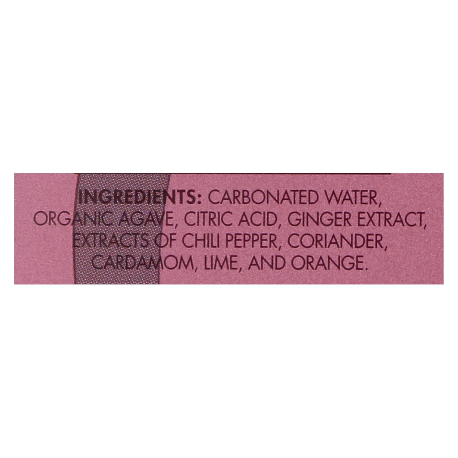ingredients : carbonated water;organic agave;citric acid;ginger extract;extracts of chili pepper;coriander;cardamom;lime;and orange