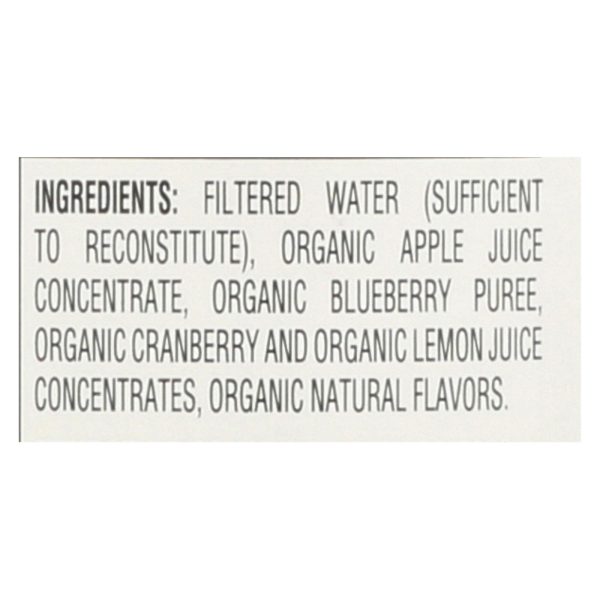 ingredients : filtered water (sufficient to reconstitute);organic apple juice concentrate;organic blueberry puree;organic cranberry and organic lemon juice concentrates;organic natural flavors